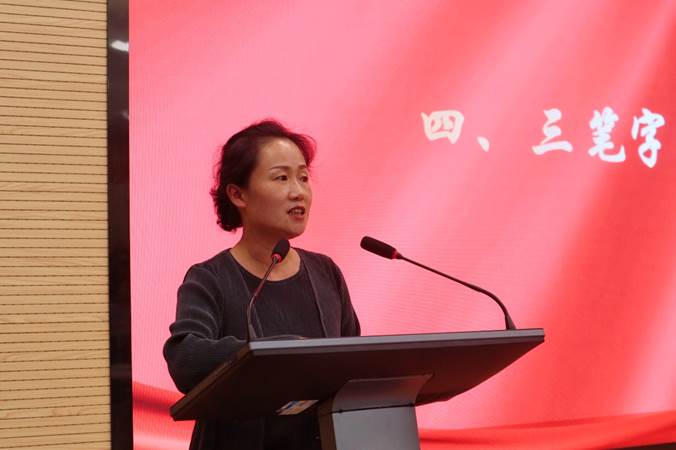 在三笔字展示环节,杨霞老师对“三笔字”的赛况作了总结。“三笔”是教师靓丽的名片,也是师范教育的基本技能。杨老师对参赛同学整体高水平的书写表示赞赏,对同学们在字体结构和审美等方面存在的问题进行了剖析。一笔一画,落笔有神;一点一横,笔墨生香;一字一句,春风化雨。杨老师希望同学们能沉醉墨海,书写人生;学以养德,奋发而兴国。之后,“三笔字”的参赛代表现场用钢笔、粉笔、毛笔分别做了精彩的书写展示。