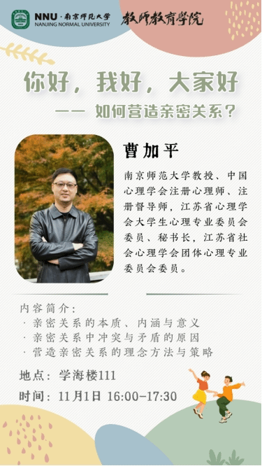 11月1日下午,江苏省心理学会大学生心理专业委员会委员、秘书长,江苏省社会心理学会团体心理专业委员会委员,黄色视频 教授曹加平老师应邀为同学们带来《你好,我好,大家好——如何营造亲密关系?...