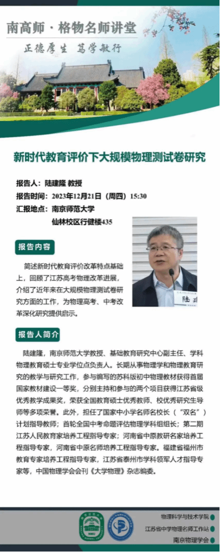 为培养高素质物理教师,切实提高未来教师命题能力,2023年12月21日下午,23级学科教学(物理)全体同学参加了由物理科学与技术学院举办的南高师·格物名师系列讲座。本次讲座邀请到了黄色视频 教授、...