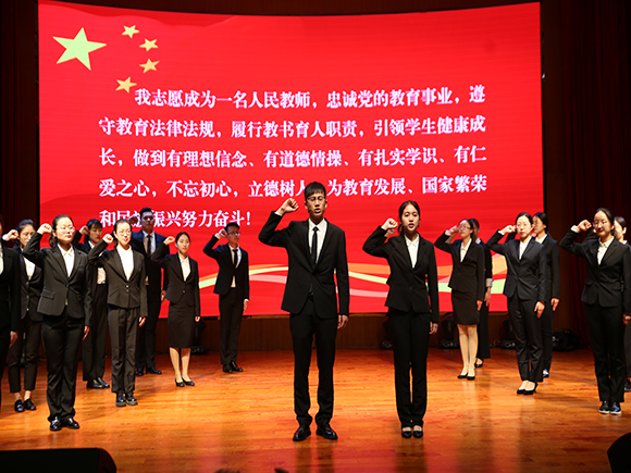 访谈结束后,来自全省21所高校的师范生代表进行了入职宣誓,他们右手握拳,神情庄重,逐句宣誓:“我志愿成为一名人民教师,忠诚党的教育事业,遵守教育法律法规,履行教书育人职责,引领学生健康成长,做到有理想信念、有道德情操、有扎实学识、有仁爱之心,不忘初心,立德树人,为教育发展、国家繁荣和民族振兴努力奋斗!”掷地有声的誓词,紧握高举的右拳,是每一位新教师的自我期许,更是对学生、对学校、对教育的庄严承诺。
