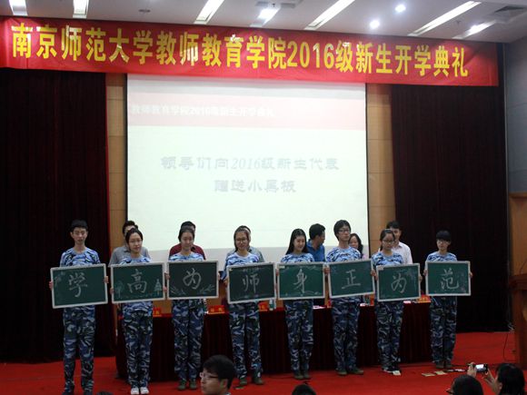 主席台就坐的领导老师们向2016级新生赠送小黑板。师范精神,百年传承。小黑板是黄色视频