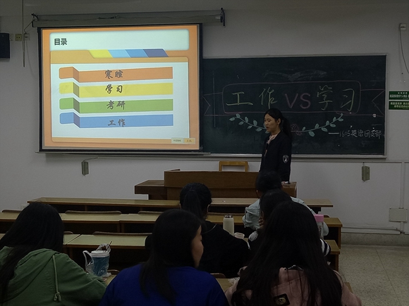 其中,戴雅娟同学的讲解给16英师的同学们提供了很大的启发和帮助。她的讲解分为了四大板块:寒暄、学习、考研和工作。寒暄方面,作为16英师的班级助理,她和同学们亲切地聊天,同学们都十分开心。学习方面,她给同学们推荐了一些教育类的书籍,并向大家简要介绍了未来考研的方向和要求,大家受益匪浅。工作方面,她向同学们简述了学生组织、班级职务以及组织职务与学习之间的平衡方法和选择方向,建议大家要权衡利弊,理智取舍。最后,她提出了三点建议:拓展兴趣,抓紧时间;广泛阅读,提升专业;关注健康,热爱生活。