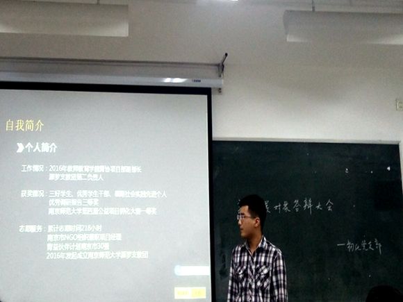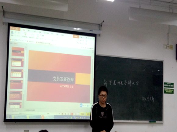 会议一开始由支部书记说明会议流程及评委打分标准,接着由25位入党积极分子轮流上台进行4分钟以内的自我陈述,从入学以来的工作、学习、思想、志愿服务、平日参加支部活动等方面,对自己进行总结,还要分享自己学习党的基本知识及关注的时事热点所获得的心得体会。仲朴星同学谈及自己对最近萨德部署事件的看法及中国对应的措施,条理分明、逻辑清晰,可见其对国家时事的关注及自身的思考;魏代娜同学谈及对党风党纪、党员批评与自我批评的认识;李滨同学谈及自己对民主集中制的看法与理解,分析的到位较透彻;徐中昊同学谈论改革开放前期党的历史,足见其平时对于党史的学习与思考,台上落落大方、从容镇定、幽默风趣,且群众基础较好。糜雪同学认为党的最大政治优势是密切联系群众,党执政后的最大危险是脱离群众,感悟深刻。其他同学表现也都非常优秀,明确表达了自己入党志愿。