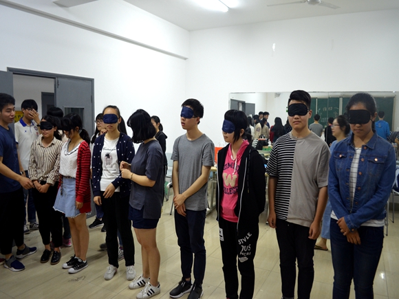 活动伊始,同学们玩了一个“松鼠与大树”的游戏,调动了大家的积极性,现场气氛热烈。紧接着,大家玩了一个“摔鸡蛋”的游戏,经过分组后,各组齐心协力,用10支吸管制作缓冲物,确保在下落时鸡蛋不会碎。这个游戏,展示了团队的合作与才智,其中一组在总结失败的教训后,在第二次试验时成功了。之后,主持人让大家拿出纸笔,写下大约10个描述自己个性和特征的词语,并分享与交流,最后主持人总结每个人都是独特的的个体,我们都需理解他人,站在他人的角度。活动最后,进行了有关于信任的游戏,大家带好眼罩,手拉手跟着领头人,全程不许交谈,通过一个个障碍,最后回到原教室,然后松开手,再次寻找黑暗中牵自己手的人,最后大家基本复原成功。