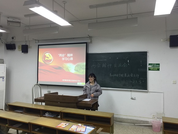 在两会各项议程如火如荼进行之时,英语支部的正式党员和预备党员同志们积极行动起来,关注两会热点议题,学习体会两会精神,并撰写了感悟报告,提交支部供同志间交流学习。而此次两会精神学习交流会则是以英语支部的入党积极分子为主体展开分享交流。13名来自各个年级英语师范专业的入党积极分子纷纷走上讲台同大家分享她们的学习感悟和心得。14级的李好同学联系自身阐述了我们为何需要关注两会;徐邦菲同学从南京市、江苏省和全国三个层面来具体地分享了她对两会精神的解读。其他同学如周静怡等均从师范专业角度出发,谈到了两会关于教育的热点议题,一些同学还谈及对英语教育议题的看法。每位同学对两会的热点议题和精神都有着非常充分地了解,并且大方上台与同学分享和交流。学习交流会的最后,党支部组织委员李玉杰发表了自己的学习感悟并作了总结。