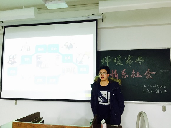 2月27日晚,教师院1401支部在仙林校区学明楼404教室召开“师暖寒冬,情系社会”主题班团活动。1401支部全体同学到场出席,陈浩然同学作为主持人主持了本次活动。