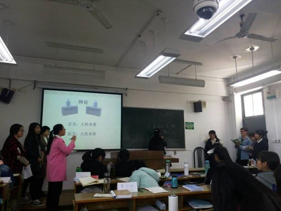 为了培养同学们的逻辑思考能力,语言表达能力,组织能力。 3月10日下午,教师院思想政治教育师范班级于仙林校区学明楼206教室举行了“人性之谜为何难解:人性善vs人性恶”辩论赛。此次活动由唐涛老师担任主持人,由赵若曦、陈梦圆、杨晴、王宁四人担任正方,主张人性善,由侯雪华、徐慧杰、安迪、欧阳露荣四人担任反方,主张人性恶。践行了“真理不辨不明”的道理。