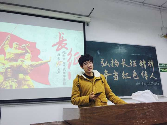 16级思想政治教育师范在学明楼 209 教室举行了以“弘扬长征精神,争当红色传人”为主题的班团活动。活动深入学习习近平总书记系列重要讲话,回顾了红军在中国共产党领导下艰苦卓绝的长征历程。