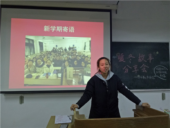 “江浦雷声喧昨夜,春城雨色动微寒”,春寒料峭,突如其来的雨给南京带来了一丝寒意,暖冬故事分享会在这春寒中温暖地拉开了帷幕。本次分享会团支书赵玥同学主持,主要分两个环节,暖冬故事分享和新学期寄语。首先赵玥同学总结了同学们寒假社会实践的总体情况,并介绍了本次分享会的主要内容。接着沙稼璐、夏子杰、倪佩玉同学依次进行了精彩的分享,讲述了使这个冬天升温的暖心故事。作为未来教育事业的接班人,沙稼璐和夏子杰同学给我们分享了暑假支教以及寒假重回支教点看望孩子送温暖的经历。照片中孩子们天真的笑容和志愿者真诚的,视频里孩子们稚嫩的歌声和校长偷偷抹下的热泪,那份感动与温暖伴随着音乐深深印在了同学们的心里。倪佩玉同学主要分享了寒假的学习生活和家乡的特色年俗。享受假期的同时也不忘学习相伴,给大家树立了一个好榜样。最后班长姜明姗同学总结发言并发表了新学期寄语,希望心得学期大家依然携手共进,共建一个更加优秀更加温暖的数师班。
