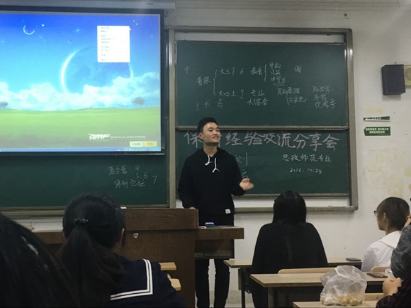 10月23日晚,16级思政师范班同学来到仙林校区学海楼223,与14级思政师范听取13级学长学姐的保研经验。本次会议由14级班委组织,以为思政师范同学介绍丰富的保研经验,拓宽相关保研知识为目的,为思政师范生的人生规划提供经验。