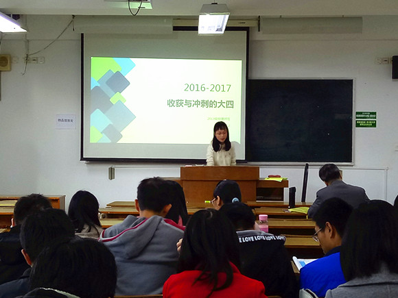 班会的第二部分为“冲刺的大四”。新任班长秦季茜公布了班级毕业去向意向的统计结果,并再一次强调了毕业论文的开展工作,随后,新任的其他班委依次上台发言,向同学们表述自己对未来一年学习工作的期望与信心,并为所有考研、工作的同学喊“加油”。最后,陆教授上台进行总结,发表了一些自己对班主任工作、考研等问题的看法,并寄予同学们最好的期望。