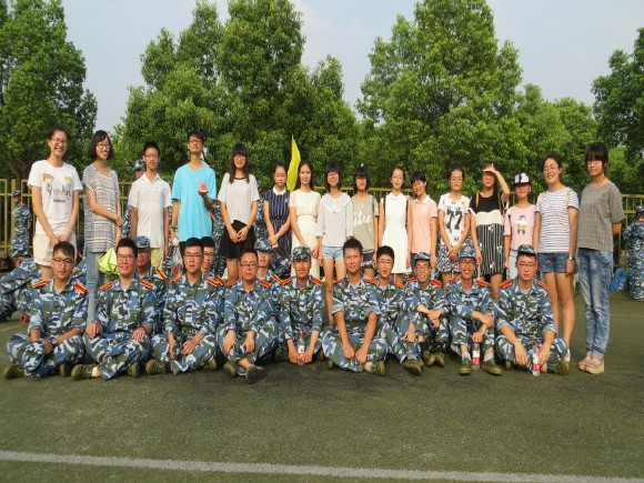 看到学长学姐,新生们格外开心、感动。教官也允许了他们稍作休息。一块块流着鲜红汁液 的西瓜被分发到新生们手里,似乎给炙热的草地带来了一阵清凉的风。在他们贪婪地吃着西瓜的同时,学习委员向新生们简单介绍了15级班委和部分同学,15级同学询问了新生的训练情况和感受,与他们亲切谈论了开学以来的所见所闻。