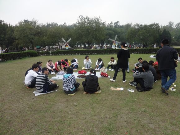 首先进行的是自由活动,同学们各自归各自地前进,深入玄武湖公园的中间,领略玄武湖的自然之美,感受玄武湖的自然之气。一处一处地逛,一处一处地拍照,最后,同学们来到了划船的地方,凑齐了四个、四个人,同学们便迫不及待地跳上了船,开始了一小时的划船之行。最后,到了十二点半的时候,同学们在情侣园教堂前的草坪上集合,有的在吃准备好的午饭;有的围成了一个大圈,开始了狼人牌的游戏;有的在聊天。差不多一点半的时候,所有的同学围成了一个大圈,玩起了游戏。从一开始的自我介绍兼真心话大冒险,到摸手游戏,到松鼠大树的游戏,同学们玩得不亦乐乎,笑声不断。同学们一边做着游戏,一边聊天,不知不觉中,使得数学与应用数学师范班更加和谐,更加温馨。