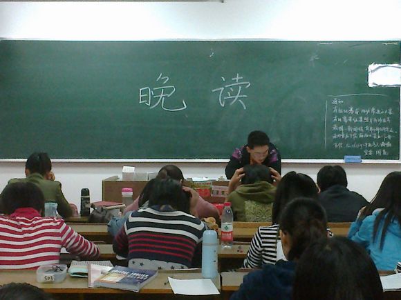 十月十七日晚上六点十五分,教师院2011级英语师范班学习委员管春华进行英语单词默写,同学们下笔如有神,想必复习工作十分到位。随后的批改工作也进行得非常顺利,会心的笑容是大家的学业有成的最好证明。之后的晚读大家也都非常认真,《现代大学英语》,或者是自己的读物,大家都读得津津有味,一边欣赏英文美文,一边提高自己的口语,不亦乐乎。