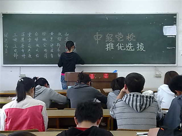 下午3点,竞选开始。王晓静同学首先介绍了竞选的流程,并强调,同学们在投票时一定要本着公平公正的原则。竞选者依次上台宣读了演讲稿,在全班同学面前,庄严的表达自己向党组织靠拢的决心。演讲结束后,每位同学在纸上写下七个名字,同学们慎重地投出了自己宝贵的一票。最后经过公开唱票,票数前七位的同学获得了中级党校名额。