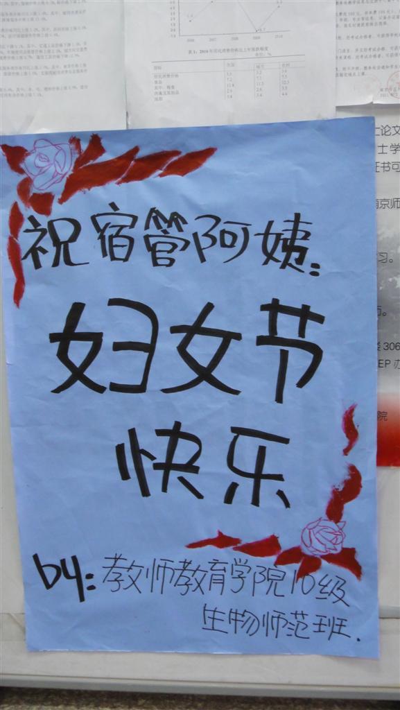 虽然作为大一新生的我们进驻北区宿舍楼不久,但是生物师范班的所有女生已经与宿管站的阿姨建立了良好的关系。回首大学的第一个学期,我们在宿舍中共同度过的美好而难忘的学习生活的时光,必将是我们大学生涯中最难忘的记忆之一。在大学期间的第一个三八妇女节到来之际,为了感谢宿管站阿姨平日里对我们的卫生等生活方面的严格要求和对我们生活的关心,在这个专属于她们的节日里——三八妇女节,生物师范班的全体女生为阿姨送去亲手绘制的祝福海报,并张贴在宿管站前的公示板上。