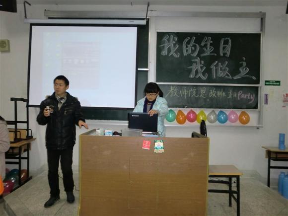 五点四十五分的教室在黑暗中透着神秘,在同学们真诚的生日歌声中,两个男生捧着精心制作的生日蛋糕从前后两扇门缓缓进入,五个寿星陈正华、杨玲玲、李群、沙依拉古丽、卓梅霞,在同学们的簇拥下登场。许完愿后大家一起吹灭蜡烛,空气里溢满了温馨与喜悦。到了班委献艺环节,思政班班长吴怡雯同学带来了校园情景剧《超人气班级》,诙谐的情节逗得全场欢声不断,同时也寄予了让本班成为南师大超人气班级的美好希冀。兼任主持人的“青年票友”徐楷森同学则带来京剧《淮河营》,抑扬顿挫的唱腔引人入胜,赢得了阵阵掌声和尖叫,也给生日会添上了“中国风”的色彩。