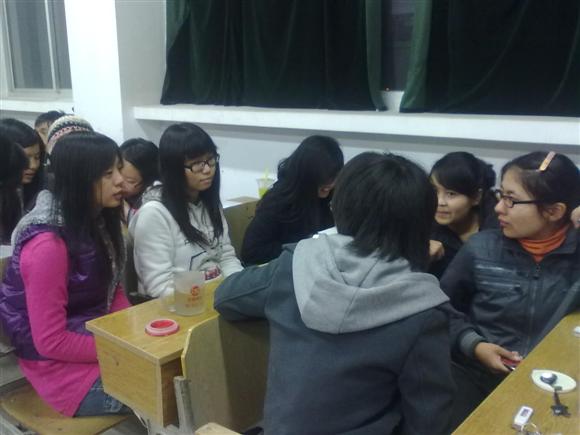 本次团日活动分为三个板块:聊聊我们现在的生活、谈谈最新教育资讯、说说未来的规划发展。首先,同学们以宿舍为单位简单叙述各自目前的生活。其中,生物班雷晓洁同学和地理班徐惠君同学与大家分享了节约水电的小窍门,几位地理班的同学也上台和大家交流宿舍布置的心得。富有创意的想法与新奇的点子令大家赞叹连连,轻松活跃的氛围中大家互相交流、各抒己见,从生活到学习无所不谈,在交流中开阔了视野,促进了彼此的共同提高。
