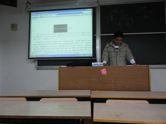 班会在肃穆的气氛中开始。由班长童晋同学主持,首先一段PPT介绍为同学们再现了南京大屠杀的历史背景以及相关史料,一幕幕惨痛的画面令同学们触目惊心,大家怀着沉重的心情再次回顾了历史,内心的悲愤排山倒海,更加意识到建设祖国使其不断壮大的重要性。
