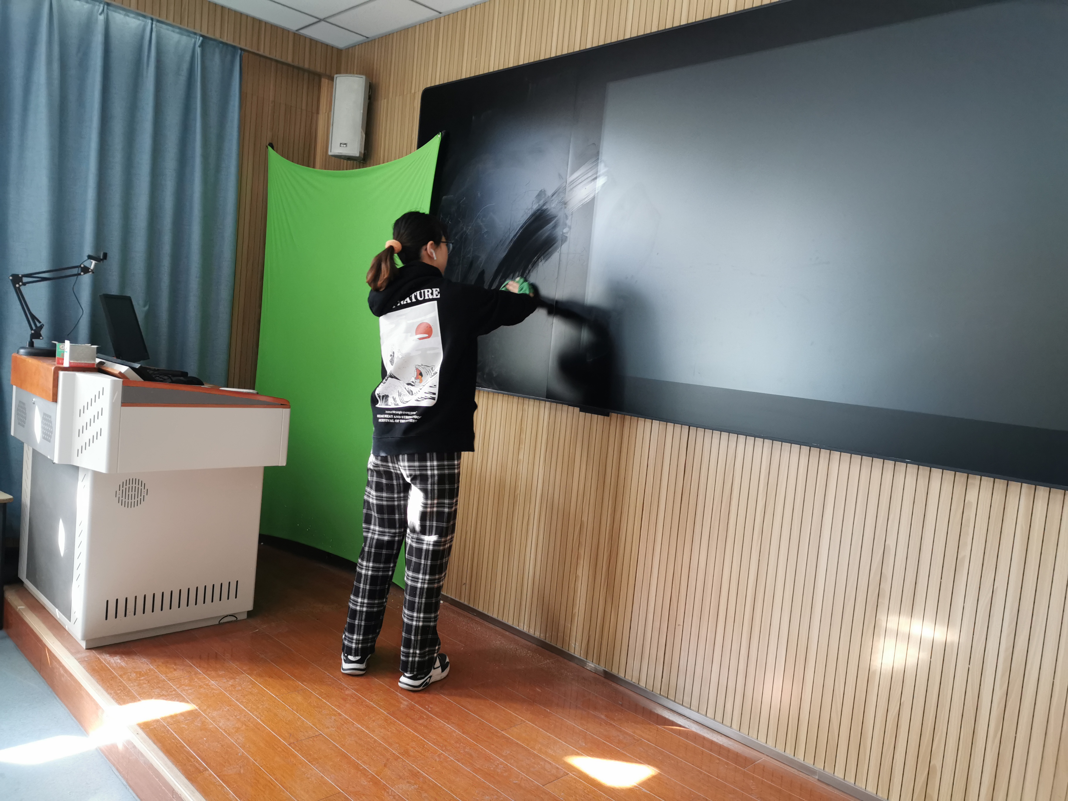 本次共有六间教室需要打扫,由两位同学合作负责两间教室的打扫。志愿者们各司其职,认真的做着自己分配到的工作。扫地的同学在把教室里的垃圾和灰尘扫出来后还不忘把走廊也清理了。负责拖地的同学拎着长方形底面的大拖把一次次地从走廊中间穿过,拖完了这个文体艺术教室就去洗拖把再去拖文综教室,反复操作,直到把六个微格教室地板都拖得干干净净。负责黑板的同学一开始被呛了不少粉笔灰,但她们很认真地用干净并浸湿的抹布擦拭,最后每一块黑板崭新如初。负责摆放桌椅的同学很细心地从行和列两个方向看桌椅是否整齐。志愿者们还检查了各个微格教室的多媒体设备是否能够正常运作,确保大家可以在微格教室正常上课。在志愿者们认真又辛苦的打扫之后,九个微格教室焕然一新,在阳光的照耀下显得温暖明亮。
