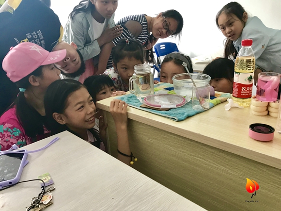 早上7点20分,虽然天空飘着小雨,志愿者们还是按时在校门口集合,一同乘坐公交车前往志愿地点。到达东沟后,雨势逐渐增大,但志愿者们仍然坚持前往。来到教室,虽然因为天气原因,小朋友有一部分没来,志愿地点也换到了更小的教室,但小朋友们的热情依然不减,远远地就站在门口迎接志愿者们的到来。经过短暂的休整,课程就开始了,但在课程正式开始之前,何羽同学先向大家介绍了暑假期间的活动安排,并鼓励小朋友们踊跃报名。今天的第一节课是由冯睿同学带来的化学实验课。课上,冯睿同学主要给小朋友们简单地介绍了水的各种特性与小知识,接下来就是一连串有关于水的妙趣横生的小实验。这些实验一下子就激起了小朋友们的兴趣,他们纷纷亲自动手尝试。课堂气氛异常活跃,直至第一节课结束,小朋友仍觉得意犹未尽。课间活动后,第二节课就开始了。第二节课是由龚敏同学主持的团队心理辅导,主题是“你是最好的”。首先是一次击鼓传花,小朋友们需要说出自己喜欢的人或事并说出原因。随后龚敏同学让小朋友们朗读了一首小诗,接着便是第二次击鼓传花,这一次小朋友们需要仿照刚刚的小诗,用“……没关系”造句。这次团辅的主要目的是让小朋友们能够加强对自己的自信心,培养更坚强的性格。随着最后一轮击鼓传花的结束,本次志愿也迎来了尾声。