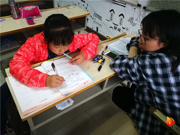 最后有一个看图写作的任务。这一直是一些小朋友们的薄弱点,他们对这项作业总是一筹莫展。志愿者们先耐心的让那个小朋友们指出图画里包含的人物,神态和语言,在描述出每幅画讲述的内容,压缩成一句话表达写在图画外,然后考虑到几幅图画的关联性。小朋友们按着志愿者提供的步骤认真思考并进行回答。志愿者们对他们遗漏的关键地方一一加以补充。最后小朋友们都能够自己成功的把看图写作的作业完成。最后志愿者们再一次帮小朋友们查漏补缺。