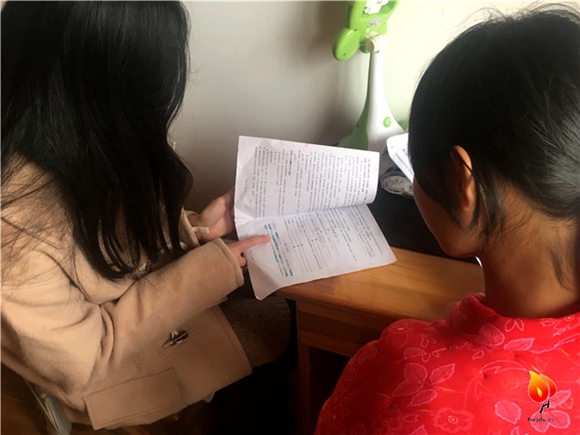 然后,志愿者得知小朋友有背书和学习新概念英语的任务时,主动提出要监督她背完。志愿者对小朋友进行了课文抽背,背错的地方立马给出指正,时而进行提醒,帮助小朋友理解和记忆课文。