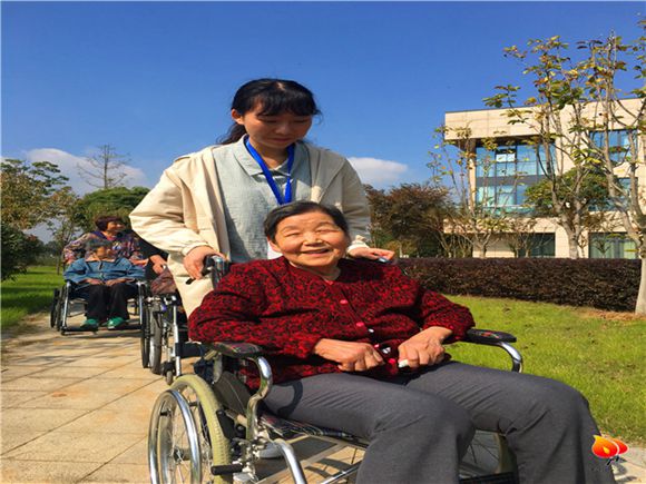 患有阿兹海默综合症的老人们居住在欧葆庭颐养中心一楼的记忆中心,志愿者这样说道:“每次看到这些老人们,不像是在看年龄大的长者,而像是在看着一群缺少关爱的小朋友。”进入记忆中心后,老人们正围坐在桌子边上一起吃水果,为了更好的服务老人们,工作人员和志愿者们协商一致,准备带老人出去散散步,正值今天是重阳节,老人们的家人们也来这里看望老人们,志愿者们也把自己当作老人们的家人,跟他们一起度过重阳节,和他们聊聊天,哄他们开心。外面阳光正好,微风拂面,正适合老人们去放松心情。工作人员给不方便走路的老人都配备了轮椅,保证至少有一个志愿者或者工作人员是负责老人的。一出门,看见大好的阳光,老人们兴致高昂,有一个平常少言的老人这次也毫不吝啬她的笑容,面对镜头拍了许多照片,途中,有一位老人在工作人员的鼓励下,还唱起了他们那个时代的经典歌曲《东方红》,引发了老人们的大合唱,并在歌声中结束了今天的志愿活动,很是温馨。