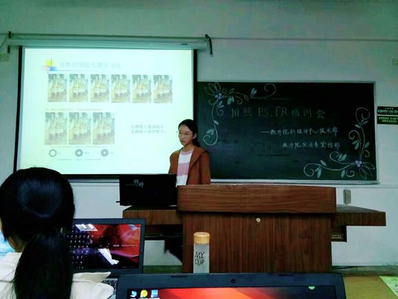 首先,新媒体中心技术部部长陆海慧同学通过展示实物为大家讲解了单反照相机的构造和各部件的用处,并详细介绍了正确的持机方式和摄影的基本方法。在此过程中她积极与场下同学互动,为同学们答疑解惑。接着,新媒体中心技术部副部长麦漪凡同学以对近期干事有关海报任务完成情况的分析开始了自己的发言,她的讲解风趣幽默,为大家介绍了关于PS软件运用的方法和技巧。然后,新媒体中心技术部副部长沈帆同学用实例细致地为大家演示了PR软件的使用和注意事项,令同学们印象深刻。最后,新媒体中心技术部副部长麦漪凡同学对技术部干事们提出完善以前任务的要求,鼓励他们在未来的日子中更加积极地完成工作,努力完善自我。