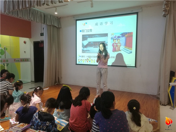 首先,志愿者芮晨寅带领小朋友们学习“程门立雪”这个成语以引出教师的主题;接着,志愿者芮晨寅带领小朋友们进行“你说立正我反转”的游戏,小朋友们的参与度很高,也都非常聪明,都没有人犯错。然后,志愿者芮晨寅为小朋友们讲了“圯上敬履”的历史故事,小朋友们听得十分认真,还不时地举手提问。根据小朋友们喜欢玩游戏的特点,志愿者芮晨寅又设计了一个“你比划我来猜”的小游戏。最后,志愿者芮晨寅教小朋友们学习了三句赞美老师的古诗词。当志愿者芮晨寅问小朋友们平时有没有学过背过古诗词时,小朋友们的回答十分逗趣。有的小朋友说:“我自己会编古诗”,有的小朋友说:“我背完一首古诗,妈妈会奖励我一块钱。”现场笑声不断。