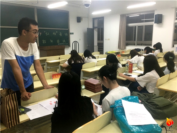 因为是第二次的招新面试,所以来面试的新生相较于第一次面试明显少了许多,但是各个部门的老干事们依旧鼓足干劲,随时准备着迎接来面试的新生。面试一般是采用“二对一”或者“三对一”的形式,即两个或三个部门的老干事对来面试的新生进行全面的提问和测试。在要求了基本的自我介绍后,是提前准备好的面试问题。各部门对问题重点的侧重不同,如宣传部侧重对各个软件的掌握情况,项目部会要求新生在现场设计问题解决方案等。面试过程中,新生有的显得比较紧张,有的从容不迫,侃侃而谈。他们大多都对志愿工作的设计和组织感兴趣,这也是我们“红烛”青协组织的精神所在。