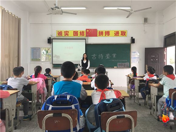 此次活动以授课为主要形式,主讲人鲍洁向三年级的孩子们讲解“古诗鉴赏”的相关课程。在上课前的准备措施布设备置齐全后,主讲人带着孩子们进入了别开生面的“古诗鉴赏”课堂。她首先简单介绍了《永遇乐 京口北固亭怀古》的作者——辛弃疾的生平,接着带领同学朗读了这首宋词,分析了这首诗歌的背景。然后志愿者从诗歌内容层面上赏析了诗歌丰富的典故,重点分析了诗歌背后流露出的情感,“诗之灵魂在于情,情真意切才是真” 孩子们纷纷举手表达自己的初步见解。最后,志愿者领导孩子们思考这首诗的相关哲理,孩子们听得专心致志,并在激昂豪放的辛弃疾诗歌欣赏中,恋恋不舍地结束了本次“古诗鉴赏之旅”。