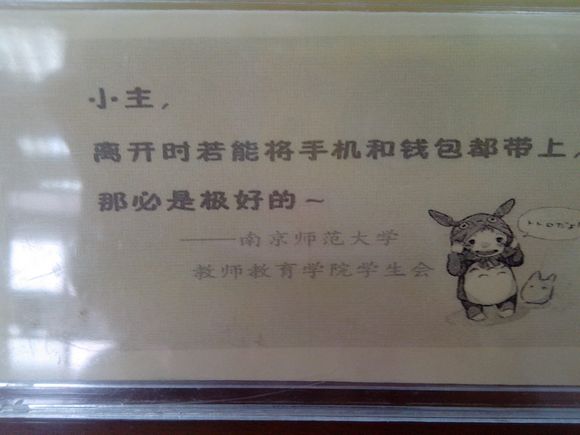 生活服务中心的同学们对此次合作高度重视,共提供5张用于大厅刷屏机显示的样稿,12张桌卡提示的样稿,或清新、或简洁,以及各种风格的防盗提示标语,如含蓄古风体“目之所及,物之所至,多留心,谨防盗。”、时尚甄嬛体“小主,离开时若是能将包和手机带上,那必是极好的~”等等。图书馆此项活动负责人评价说:“他们所制作的防盗标语和小贴士图像活泼,语言生动,而不是生硬的说教,让广大同学更容易接受。”