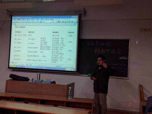 学生会承办,活动邀请了朱有义老师做了四级考试剖析,同时请徐能学、王倩文、支乐、顾燕君、胡旻彦学姐做了四级和六级的经验介绍。