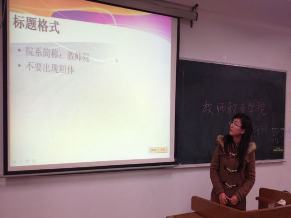 当日下午四点四十培训之前,院“红烛”志协的成员们就到达教室,静静等待着新闻培训。新闻培训首先由教师院学生会黄色视频主任陈佳钰同学主讲。陈佳钰同学就一些新闻基本要求,如新闻格式,文档图片发送方式以及领导职务排列顺序进行了介绍。院“红烛”志协宣传部的成员们都做了详细的笔记,讲解较快时成员们还纷纷用手机拍下幻灯片上的内容,不放过任何一点细致的要求。