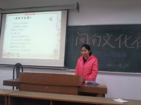 闽南文化社在仙林校区学明楼210教室举行首次见面会暨文化社第一次活动。虽然天气很冷,但是同学们还是不畏寒风来到教室参加活动。本次活动,包括以下内容:闽南文化视频介绍,社团介绍,闽南语笑话,闽南语教学,闽南语抢答,以及闽南歌曲欣赏。