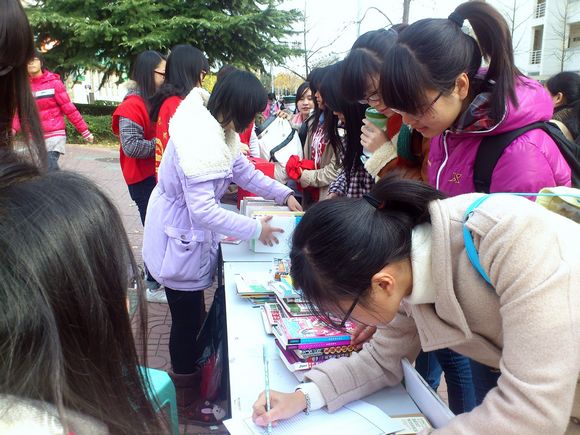 志愿者手拿募捐箱站在路旁吆喝,吸引了不少学生驻足观看。许多同学慷慨解囊,更有同学特地回宿舍拿出了自己积攒多时的零用钱捐献爱心,也有同学甚至食堂的大爷只捐钱不拿书不留名。现场气氛轻松活跃,同学们纷纷拿起笔,在留言板上写下自己对山区人的祝福,写下自己的美好愿望。