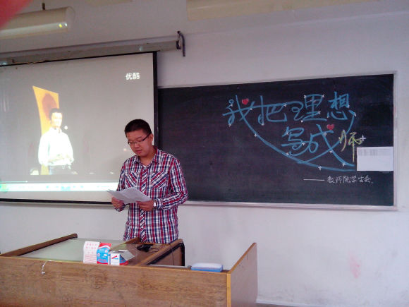 学生会大学生发展中心主办的“三分钟口才展示”系列活动的第二场——“我把理想写成师”活动。这次活动继“大声说出来”活动之后,将“三分钟口才展示”系列活动推向另一个高潮。此次活动分为两个部分,第一部分是演讲,第二部分是朗诵。本次活动由李园老师亲自指导,同时还有演朗社的成员加盟助阵。