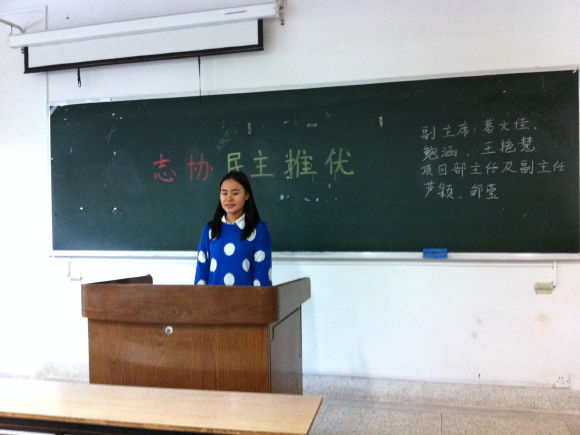 最后一项议程是推举三好学生及优秀学生干部,主要面向10、11级的同学,要求候选者在学习、工作上具有较突出的表现,思想进步,工作认真负责。参与竞争的同学讲述了自己在学习、工作上的优异表现,接着便由全体成员进行民主投票选举。