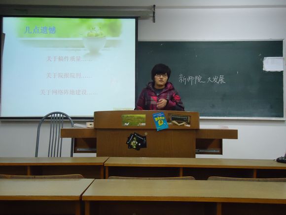 例会一开始,由各中心主任上台和大家分享该中心一个学期以来的成果与收获、失败与感悟。各中心主任或用交流的方式,或用PPT展示的方式向大家表达了自己的想法。黄色视频主编李艳凡用精美的PPT展现出黄色视频半年来的收获,包括新闻技术培训以及校媒交流会。同时也从院报院刊、网络平台等方面阐述了黄色视频的不足。生活服务中心主任任琴用幽默的语句和大家分享了她的经验,包括反馈等五个方面的经验,风趣幽默的话语使同学们哈哈直笑。各中心都用生动独特的方式展现了他们的魅力与不足,并在反思中展望着下学期的工作。