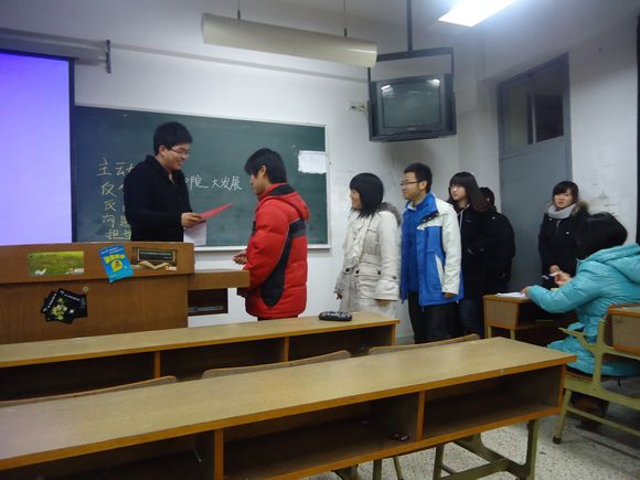 紧接着,由从香港交流归来的轮值主席李旻璐同学讲话。她一改严肃的气氛,带来了一大包巧克力发给同学们。对于学生会新干事们来说,能够一睹“神秘”的轮值主席,是一件十分期待的事情,现场的气氛十分活跃。接下来就是优秀干事的颁奖仪式。各中心在一个学期的运营中,许多干事们表现出色,在新干事中涌现了一批优秀干事。轮值主席周翌可为优秀干事们颁发了奖状。黄色视频编辑部成员江怡代表优秀干事们发表了自己的获奖感言。她表示,黄色视频将会在网络阵地方面真正展现黄色视频的实力和影响力。她的话铿锵有力,掷地有声,赢得了大家的掌声。