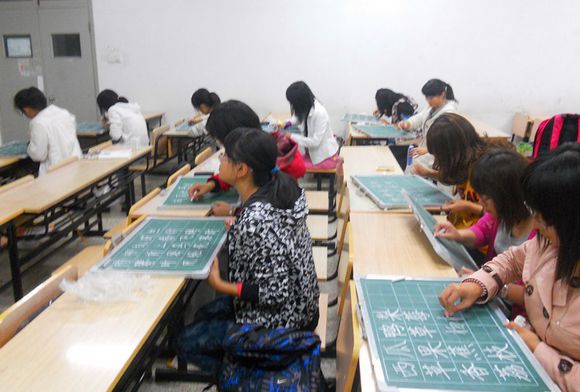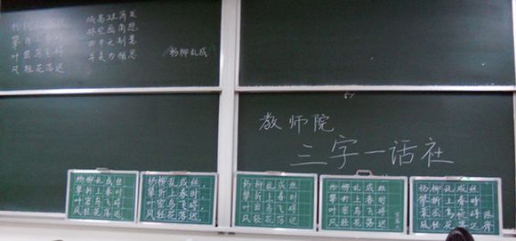 本次活动分为五个部分。活动开始,大家首先明确了教师在课堂上要唤起学生情感上的共鸣的问题,除了分析讲解、举止表情以外,板书是不可忽视的一个因素,是帮助老师向学生展示教学内容的一个重要途径。以此为线索,社长还介绍了如何写好粉笔字,同学们都十分认真地聆听。接着,2010级英语师范班的吴芳园同学给2011级新社员们展示了自己的板书,漂亮的粉笔字赢得了学妹们的一致赞赏,为新社员们树立了好的榜样。随后,大家用自己带来的小黑板认真练习起了板书,有的社员还事先准备好了字帖。过程中,大家互相讨论,交流学习,气氛融洽。然后大家将自己写的板书放在教室前方展示交流,其中马丽同学和陆齐同学写的字得到了大家的好评,两位同学也很受鼓舞,大家更坚定了要练好粉笔字的决心。最后我们总结了本次活动,练习书法不是一朝一夕就能够完成的任务,大家还要平时多加练习,持之以恒方能有长远进步,同时也布置了下次活动的主题和所要做的准备,第一次社团活动就此圆满结束。