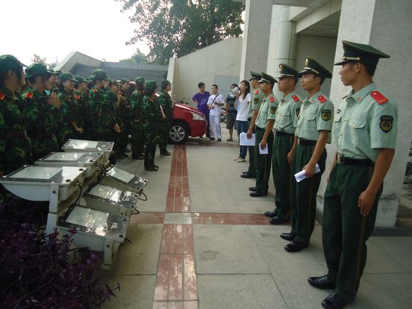 女生被编在十四连二排一班到五班,男生编在十二连。四十五分,翟老师带领教官进了南广场。见到了教官,同学们发出了热烈的欢呼声,纷纷翘首看着接下来要与自己相处十天的帅气教官。教官们年轻羞涩的脸庞虽然略显稚嫩,但是缺透露着军人般的英姿飒爽,这更让同学们欢呼阵阵。接下来,教官自我介绍以后,就开始组织同学们十个为一组排队。11级的新生们均热情地接受教官的调度。四点半以后,分组完毕。同学们热情地对教官告别,期待着接下来为期十天的军训。