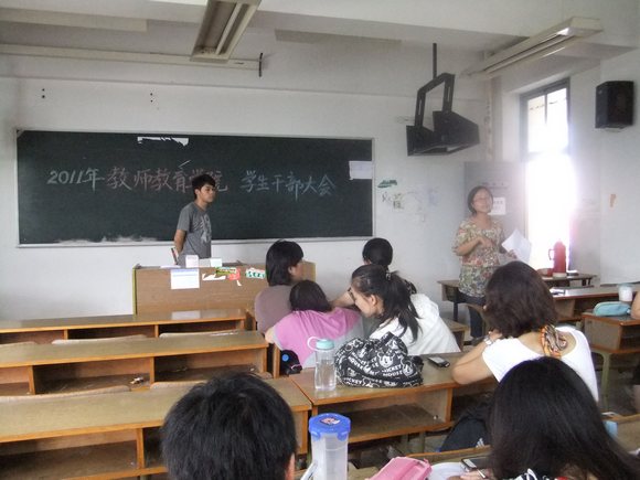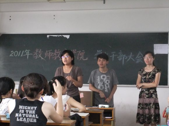 10级本科生在学明楼204教室召开学生干部大会。出席会议的有党委副书记朱冬梅老师,团委书记支景老师,辅导员翟云秋老师和教师院的学生骨干。会议在这个即将迎来新生的日子召开,旨在对迎接新生工作作出最合理的部署,让教师院的师生以最饱满的热情迎接师弟师妹。