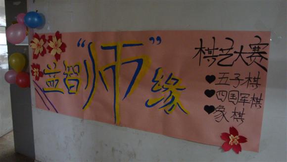 离比赛开始尚有一段距离,教师院联络中心的同学们正紧锣密鼓地进行着准备工作,几位迫不及待的参赛选手和棋艺爱好者已经提前到达了场地。气球彩带装饰下的教室一改往日的沉闷,化身成轻松愉悦的休闲园地。墙壁和黑板上鲜明抢眼的大赛标题,又在无形中增添了些微的紧张感。