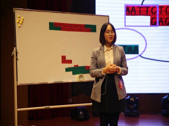比赛过程中,十位参赛选手认真作答,自信表演,均展现出良好的专业素养。化学师范的郑杨同学,将化学实验搬上舞台,深入浅出地讲解化学反应原理,为观众们带来了一场妙趣横生的化学课。生物师范马琳杰同学设计的关于模拟保护色形成的实验,理论与实践并重,化繁为简,条理清晰。汉语言文学师范的金阳同学,朗诵了一首海子的《面朝大海,春暖花开》,在幸福中携着淡然悲哀,令人动容。最后,数学师范的沈帆同学以简单快节奏的VCR视频引燃全场,调动气氛,振奋人心。第一轮比赛结束后,进行了抽奖环节。随后公布了第一轮成绩,修欣焱同学以90.2分暂时领先。
