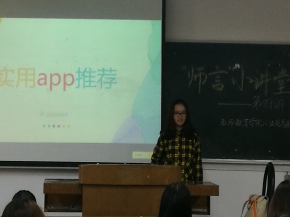 “师言”小讲堂第四讲在仙林校区学明楼303教室成功举办。本场讲座由学院16级团总支副书记张志伟主持,邀请到了16级数学师范班李艺璇同学为大家带来主题为“实用APP推荐”的精彩讲座。“师言”小讲堂是教师院16级团总支为培养学院16级同学们的课外实践能力,丰富师范生的课堂实践内容,锻炼大家的表达能力而举办的系列讲座活动。本次讲座中,李艺璇同学的主题鲜明、内容新颖,受到了同学们的一致好评。
