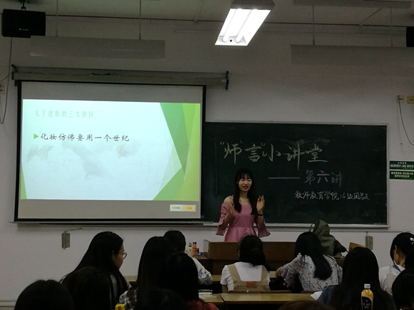 “师言”小讲堂第六讲在仙林校区学明楼210教室成功举办。本场讲座由学院16级团总支副书记张志伟主持,邀请到了16级数学师范班顾冯依同学为大家带来主题为“新人化妆保姆级教程”的精彩讲座。“师言”小讲堂是教师院16级团总支为培养学院16级同学们的课外实践能力,丰富师范生的课堂实践内容,锻炼大家的表达能力而举办的系列讲座活动。本次讲座中,顾冯依同学的主题鲜明、内容新颖,受到了同学们的一致好评。