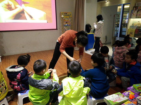 最后一个环节是动手环节。这一次的内容是教会小朋友们如何用纸折出蝴蝶。首先志愿者老师通过一个视频让小朋友大致了解如何折蝴蝶。然后在视频结束后再一步一步地教授给小朋友。最后是让主动上台比赛看谁折得又快又好,并给小朋友们发糖果以表奖励。
