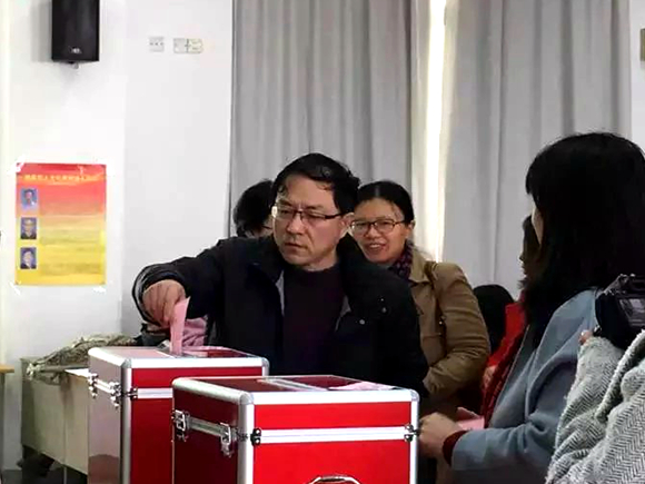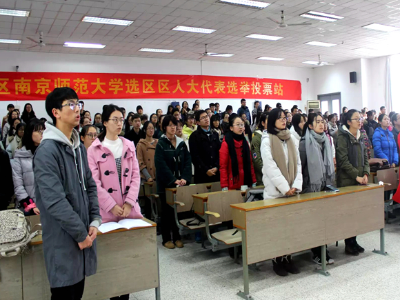 选举小组在学明楼设置了5个投票站。主投票站设在501教室,由刘更生老师主持,教师院老师和2016级文科学生参与投票。其他投票站分设在学明楼501、学明楼201、学明楼401和学明楼502,由各年级辅导员主持。主次投票站共设7个投票箱,每个投票点设2位同学负责,同时开展工作。中午,各投票站工作顺利开始,各班有序进场。“公正、公开、民主、严肃”,红色投票箱置于教室正中间,在背景五星红旗的映衬下显得庄严肃穆。刘更生书记在主投票站宣读了人大选举相关资料并强调:选举权是法律赋予我们的神圣权利,希望大家认真对待。随后,全体肃立,齐唱国歌。接着,监票计票组长向选民们讲述了选票的计数与填写要求,选民们认真学习、听讲。在各班班长发放选票后,同学们认真勾选了自己心目中的候选人,按班级,有组织、有纪律地投出了神圣的一票。